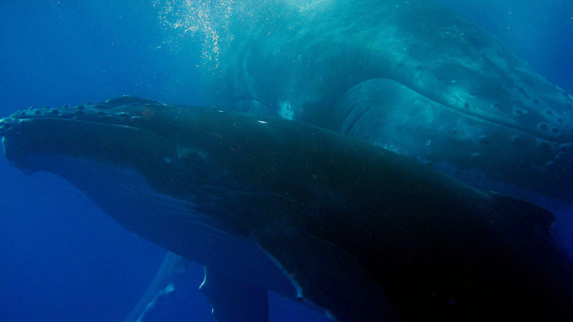 After 3 month of migration, about 6 000 km the humpback are here. Once there, they don't feed but give birth and feed the baby. This one drink 500 liters of milk per day and double is weight in 2 weeks. The baby become independant 4 years later. You should know that a wale is pregnant each 3 or 4 year and take care of this one especially the first critical year. It's during this year that the mother learn to him how to breath and how to eat. It's not uncommon to see a mother helping his son to breath, or being inside our lagoon, teaching to him to "weave" between the shoals.