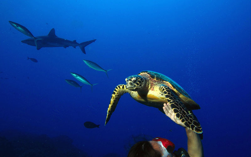 Tuna fish, rays and sometimes hammerhead sharks or swordfish come from the depths to see you.