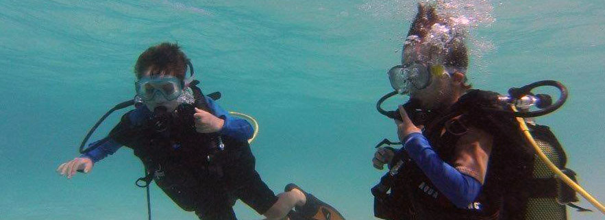 The best way for small children. A long regulator goes from the instructor’s tank. The child doesn’t have to carry a tank. He is free to move. Maximum depth: 1 to 2 meters (3 to 6 feet). Let’s have a look and see what’s possible with children. -
